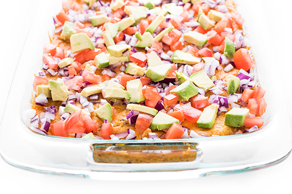 A twist on the popular buffalo cauliflower dip, my version is made with creamy hummus then baked with cheese before being sprinkled with all your favorite toppings.