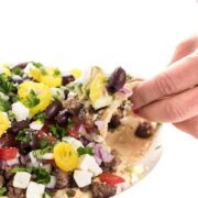 Hummus is layered with all your favorite Greek toppings including ground lamb, feta and olives. The perfect appetizer recipe for entertaining a crowd!