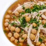 This simple, comforting chicken soup recipe is made with hearty chickpeas and whole grain bulgur wheat cooked in a classic chicken bone broth.
