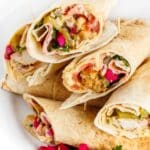 Tender, juicy chicken tawook is rolled inside pita bread along with hummus, pickles and pickled turnips. A traditional Lebanese street food recipe.