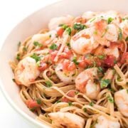 An easy 15 minute dinner recipe, this spicy shrimp pasta is made with tomatoes, garlic, chili flakes and linguine.