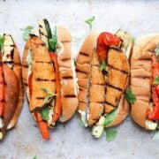 Healthy & satisfying vegetarian grilled zucchini caprese sandwich, topped with pesto mayonnaise. Perfect summer sandwich, and you won’t even miss the meat!
