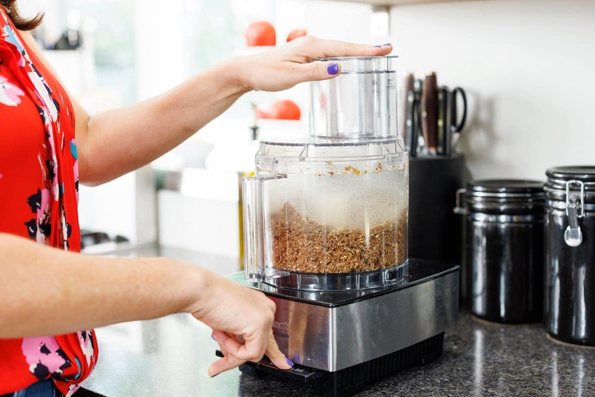 - Place all ingredients in a large food processor and pulse until finely chopped, almost the consistency of sand. This may take 4-5 minutes. Remove blade and put aside.3 cups dried figs, 1 cup walnuts halves, 1/4 cup flax seed meal, 1 tablespoon pure vanilla extract, 1/2 teaspoon salt