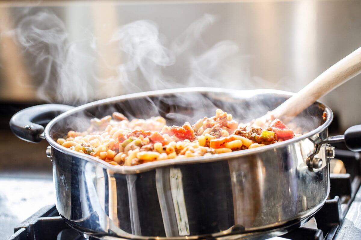 The ingredients vary from home to home but the traditional American Goulash is made with elbow macaroni noodles cooked in a hearty sauce made with onions, beef and tomatoes. Historically, salt and pepper are the only seasonings added but my husband loves oregano so I include it. While bell peppers are also not traditional, I can’t resist the opportunity to sneak in another serving of vegetables into my family’s diet.