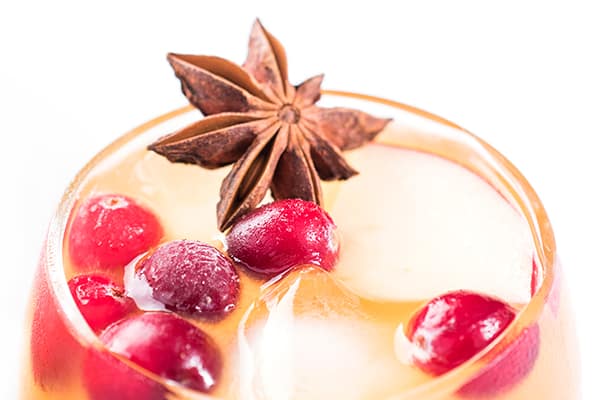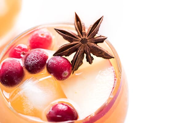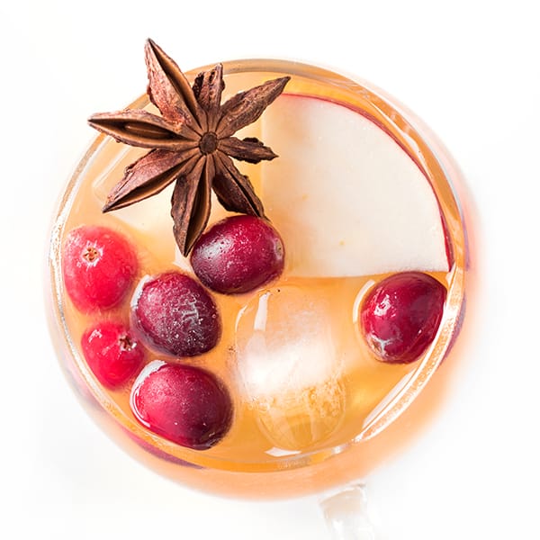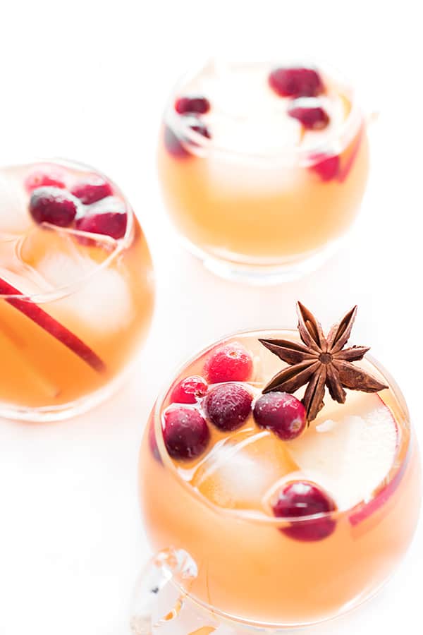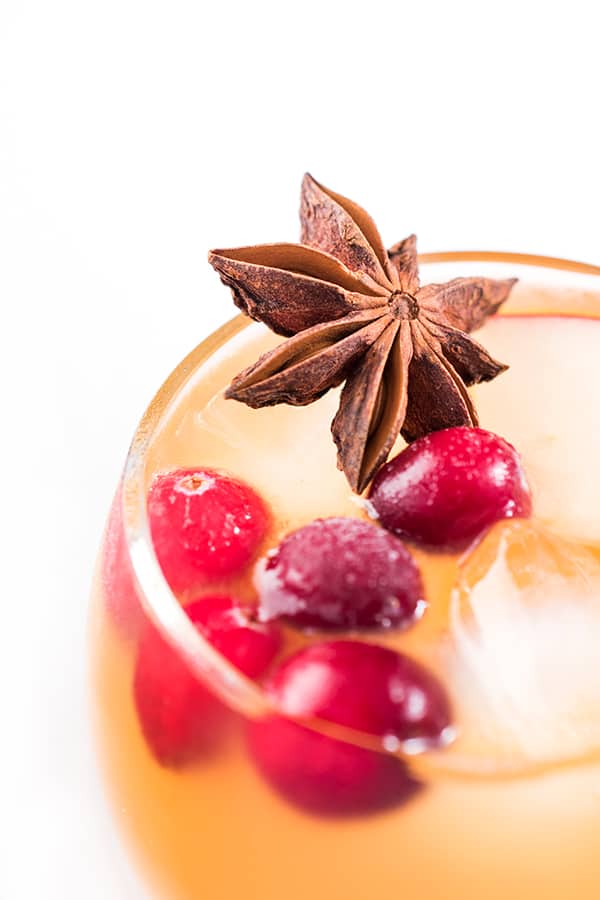 While totally optional, I love throwing in a cinnamon stick and a star of anise pod to the pitcher to add a bit of warm to the sangria. Before serving, frozen cranberries are tossed on top of each glass for garnish.