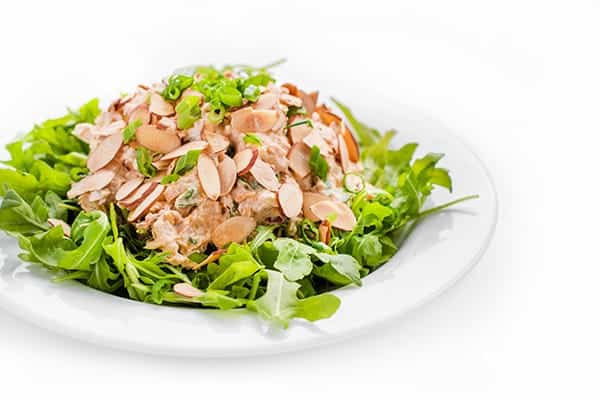 3. Serve over a bed of arugula and sprinkle with toasted almonds to serve.