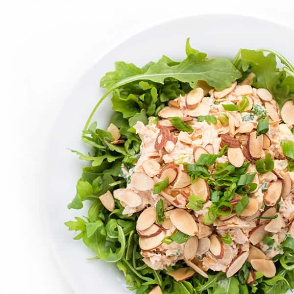To keep it low carb, I love serving it over a bed of baby arugula but any greens or your favorite sandwich bread would work. Even more time is saved by using shredded rotisserie chicken but any leftover cooked chicken works great.