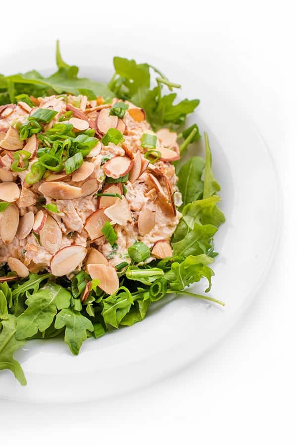 This Asian spin on a classic chicken salad is full of fragrant scallions, toasted sesame oil and crunchy roasted almonds. A naturally gluten free, low carb and paleo lunch recipe!