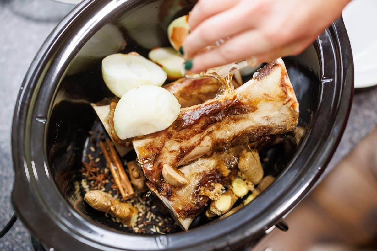 - Place roasted beef bones and all remaining ingredients in a large slow cooker and cover with 12-16 cups water (depending on the size of your slow cooker.) Heat on Low for 8 hours.