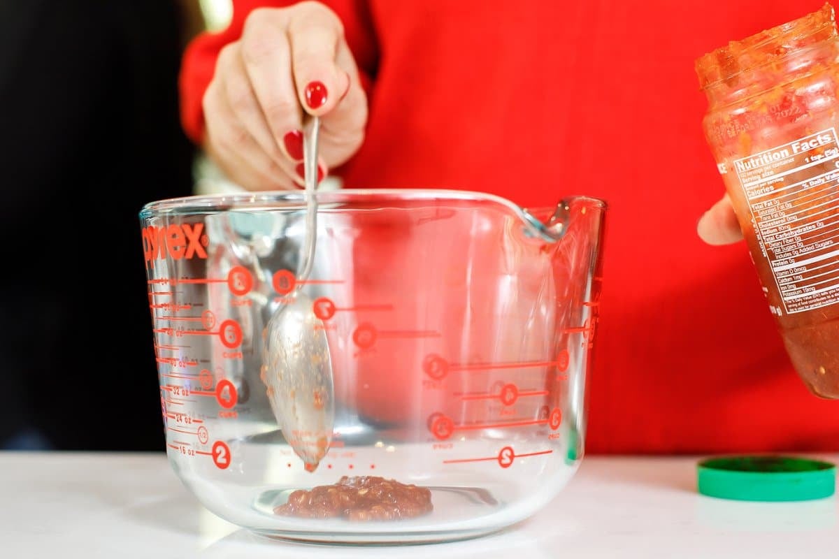 While beef skewers are resting, make the peanut dipping sauce. Warm your creamy peanut butter in the microwave then add to a larger bowl.