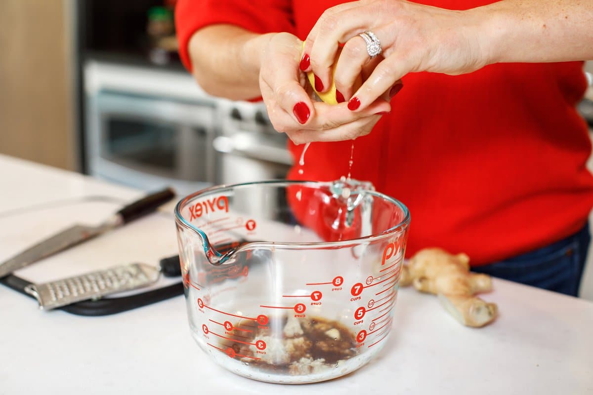 Next add the fresh ginger, garlic, and lemon juice. Whisk well until all combined.