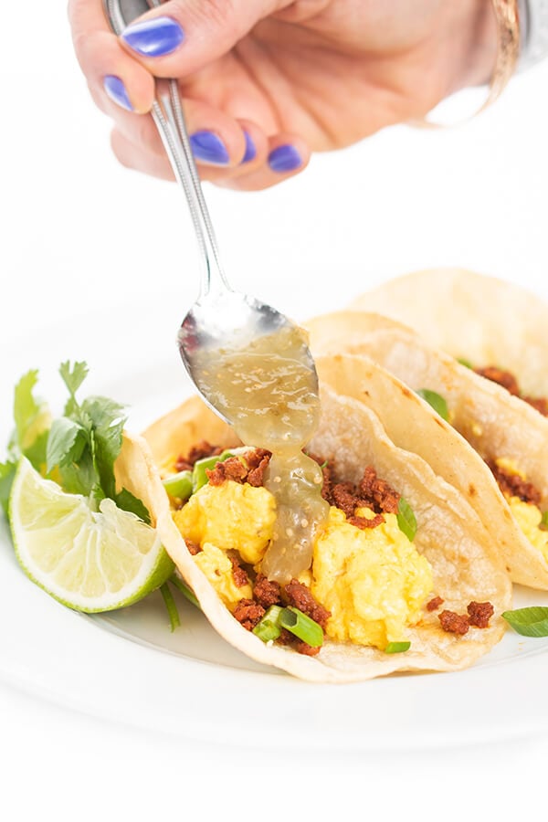 This quick and easy breakfast taco recipe is made with scrambled eggs and savory chorizo sausage then drizzled with salsa verde.