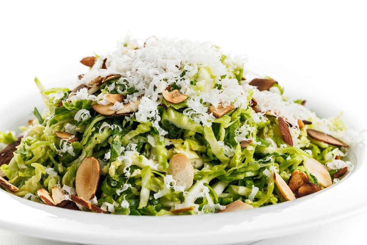 Crunchy, healthy, and versatile, a Brussels Sprout Salad with Lemon Parmesan Vinaigrette is a great winter salad. Heartier than a lettuce salad, a slaw made with Brussels is great for prepping ahead of time because it actually tastes better as they absorb more of the dressing. For added crunch, healthy fats, and texture, I toast pine nuts or almonds in the oven for about 6-7 minutes before sprinkling on top of the salad to serve.
