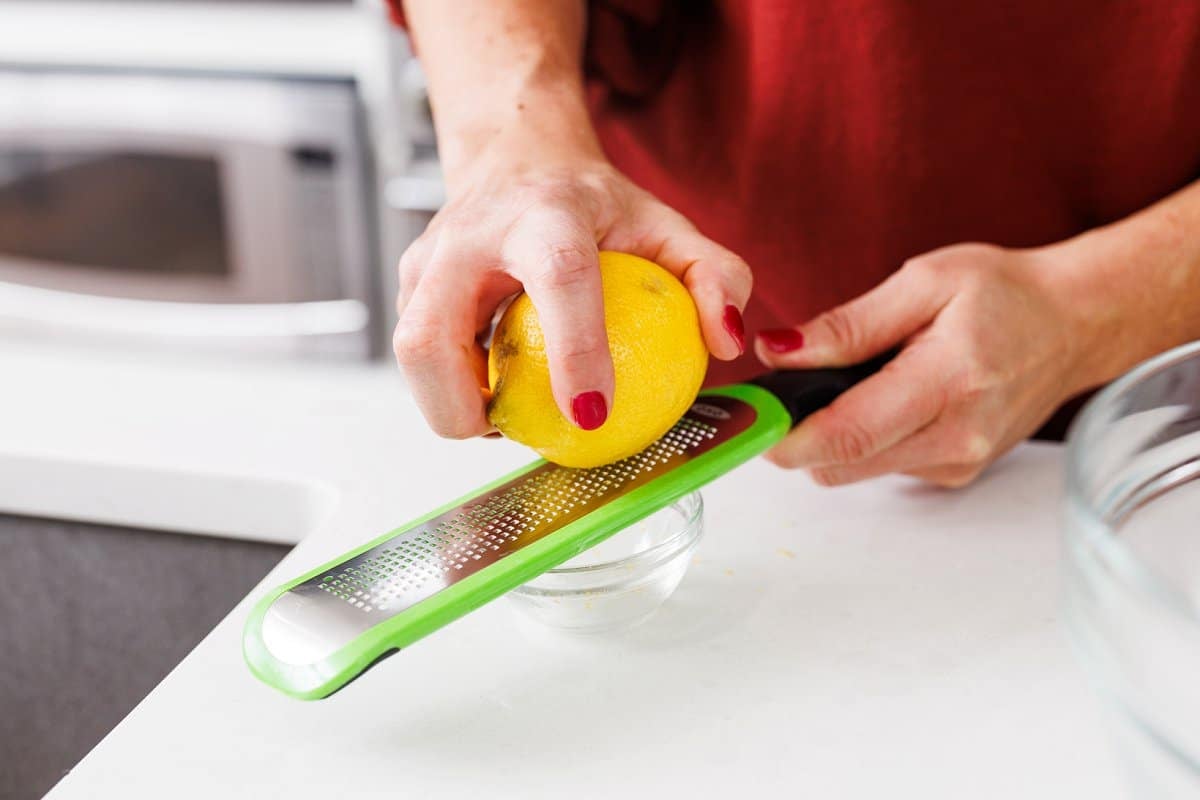 Then take a microplane and grate fresh garlic into the bowl, and zest your lemon into the bowl.