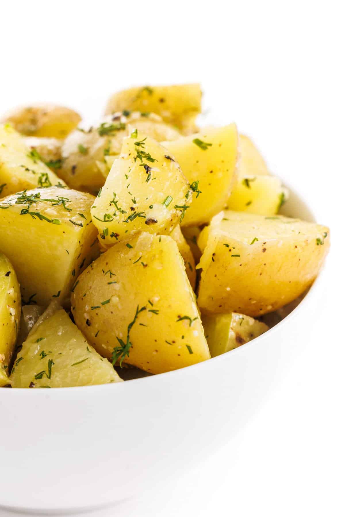 These easy Buttered Dill Potatoes is the recipe of my childhood. My mom would make this quick and simple side at least once a week. Steamed potatoes tossed lightly with butter, dill, salt, and pepper – it really doesn’t get any easier or tastier than that. Serve with roasted chicken, beef brisket, meatloaf, baked salmon, pot roast – you name it! These potatoes are versatile, comforting, and always a family favorite.