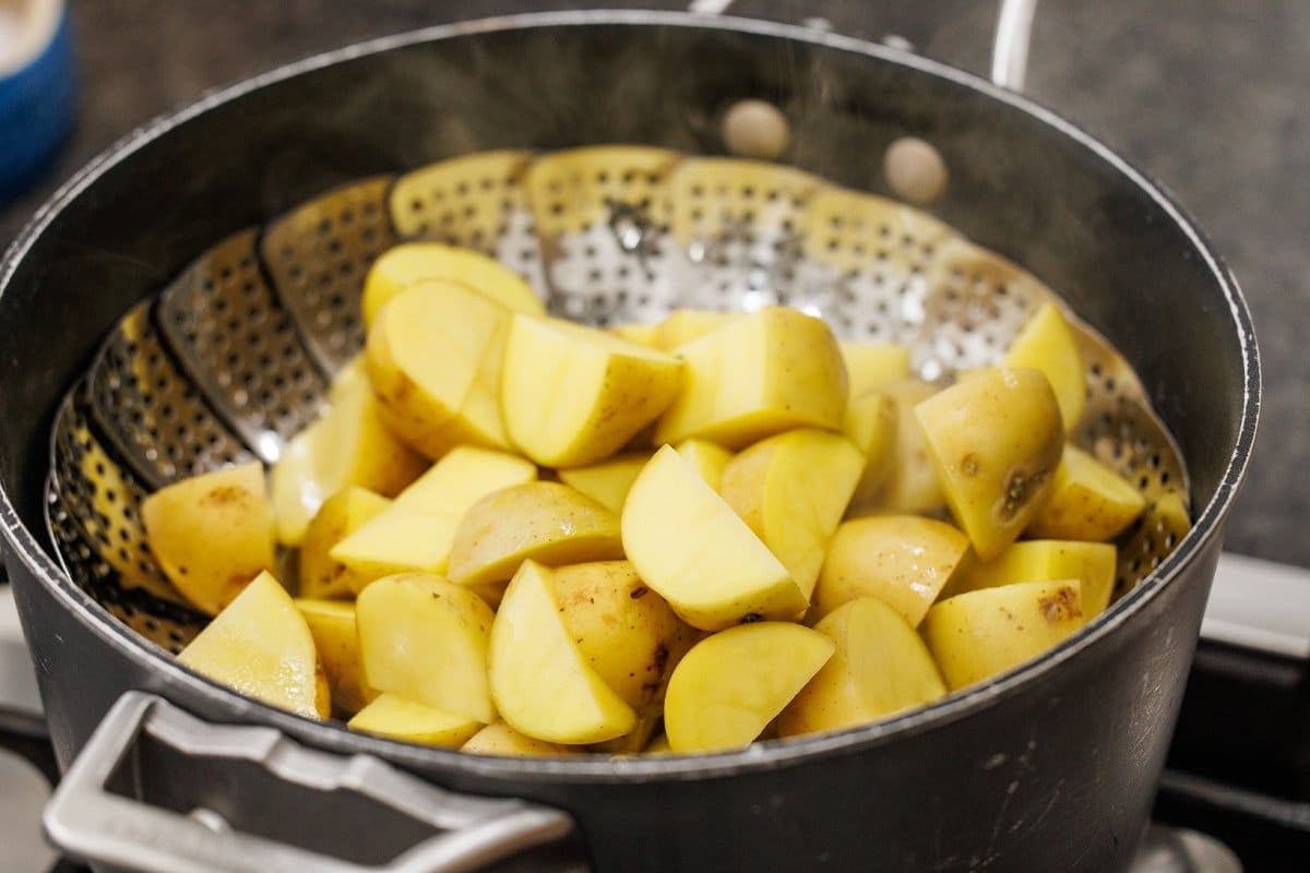 Next take a large pot and steamer basket and steam the potatoes until they are fork tender. If you have a microwave steamer, you could use that method as well!