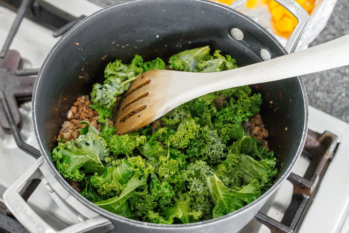 Add the chopped kale and some more olive oil, and cook until kale is wilted and bright green.