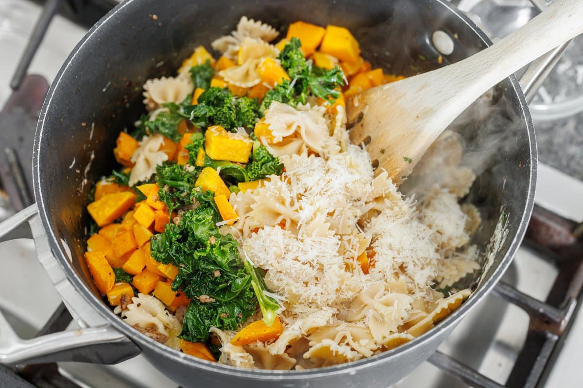 - Toss in roasted butternut squash, cooked pasta, Parmigiano-Reggiano and minced parsley. Check for seasoning and adjust accordingly.