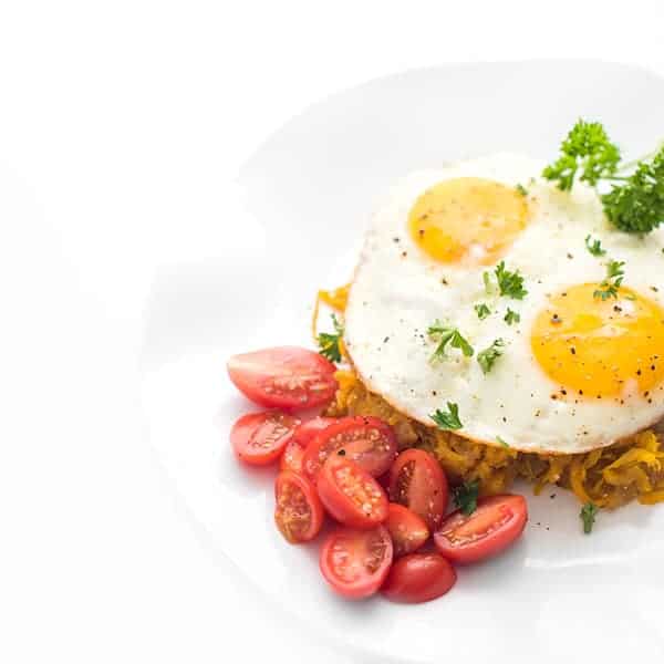 Butternut squash hash browns are seasoned then sautéed until crispy before being topped with fried eggs, or eggs any way you enjoy them! I love mine with a runny yolk but this recipe would be just as good with scrambled or poached eggs as well.