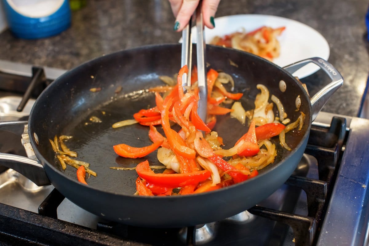 3. Heat half of the olive oil (1 tablespoon) over medium-high heat in a large, deep skillet. Add garlic and heat until fragrant, about 20 seconds, then add peppers and onions. Cook until they begin to caramelize, stirring frequently, about 5-6 minutes; remove from pan and set aside.