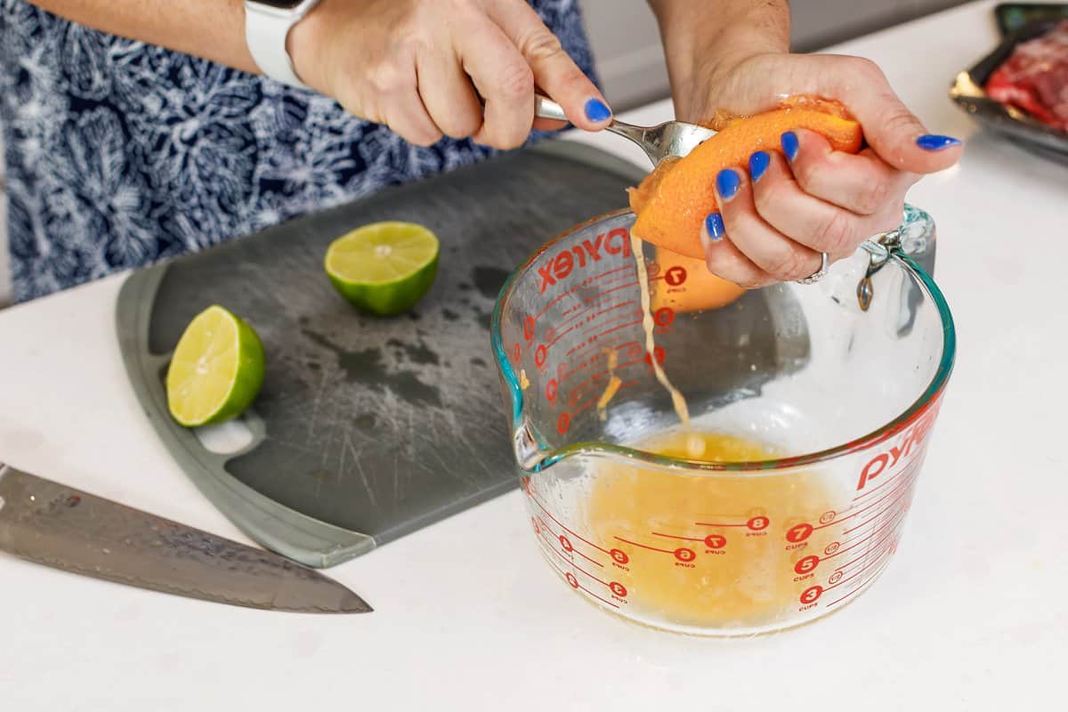 Start your carne asada marinade by juicing your orange and lime into a bowl.