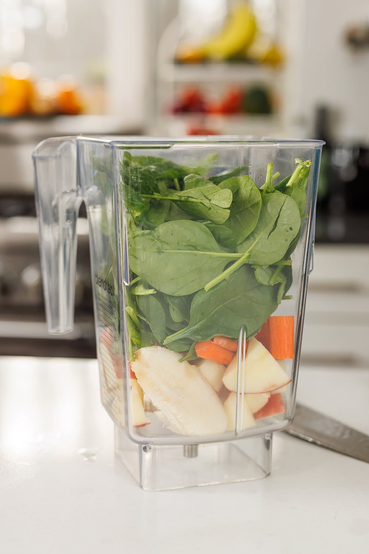 Then put all of the fruit and vegetables in your blender.