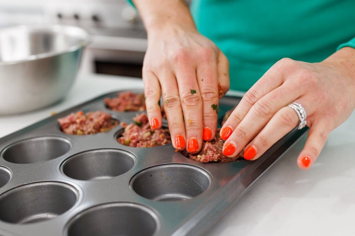 Once the ingredients are all evenly incorporated, fill a prepared muffin tin with the meat mixture.