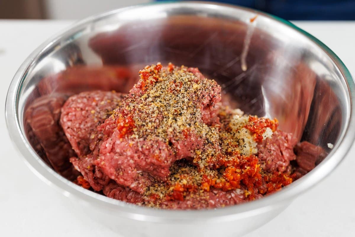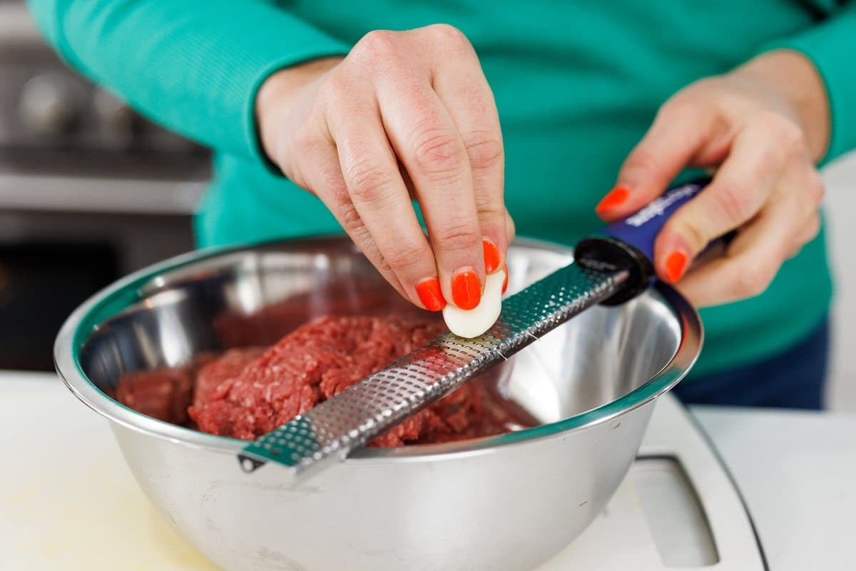 Then use a microplane to grate your garlic cloves into the ground beef.