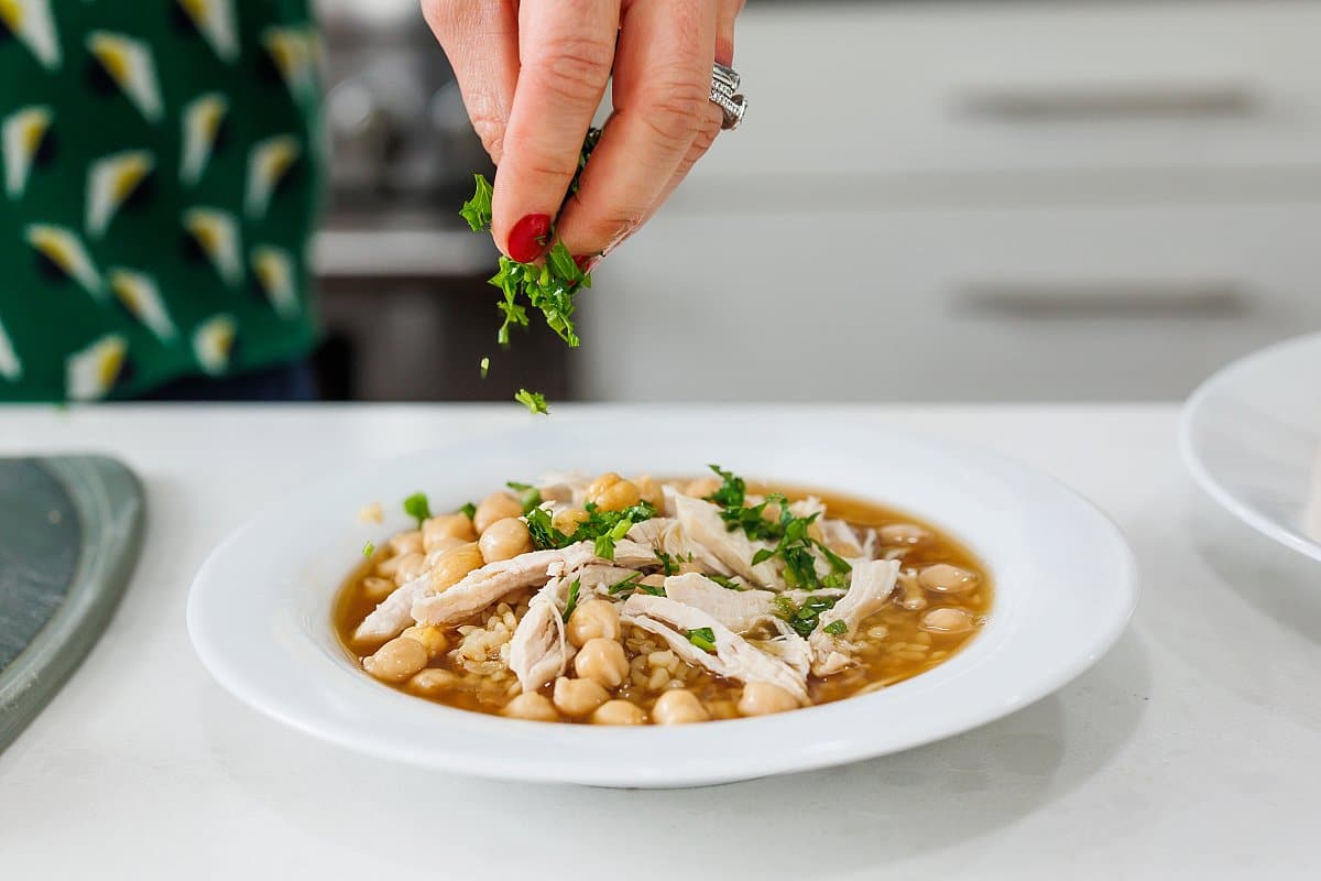 - Divide the cooked bulgur wheat between four soup bowls then ladle each with chicken and chickpea soup mixture. Garnish with minced parsley to serve.
