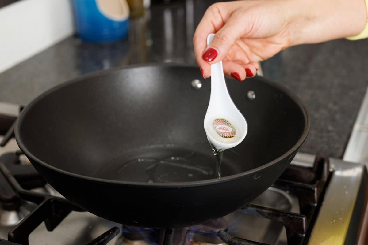 Then in a large skillet or wok, heat up some oil over medium high heat. If you want an extra punch of flavor, use sesame oil instead of canola!