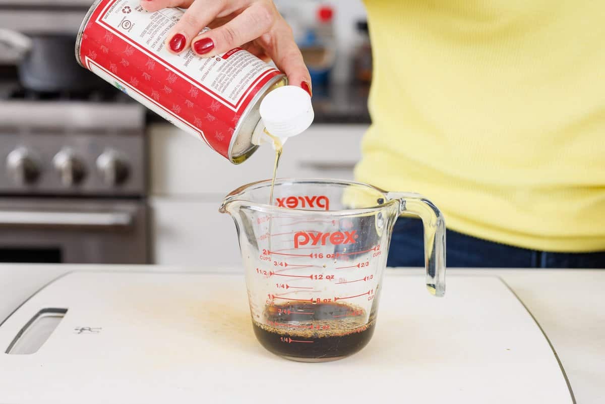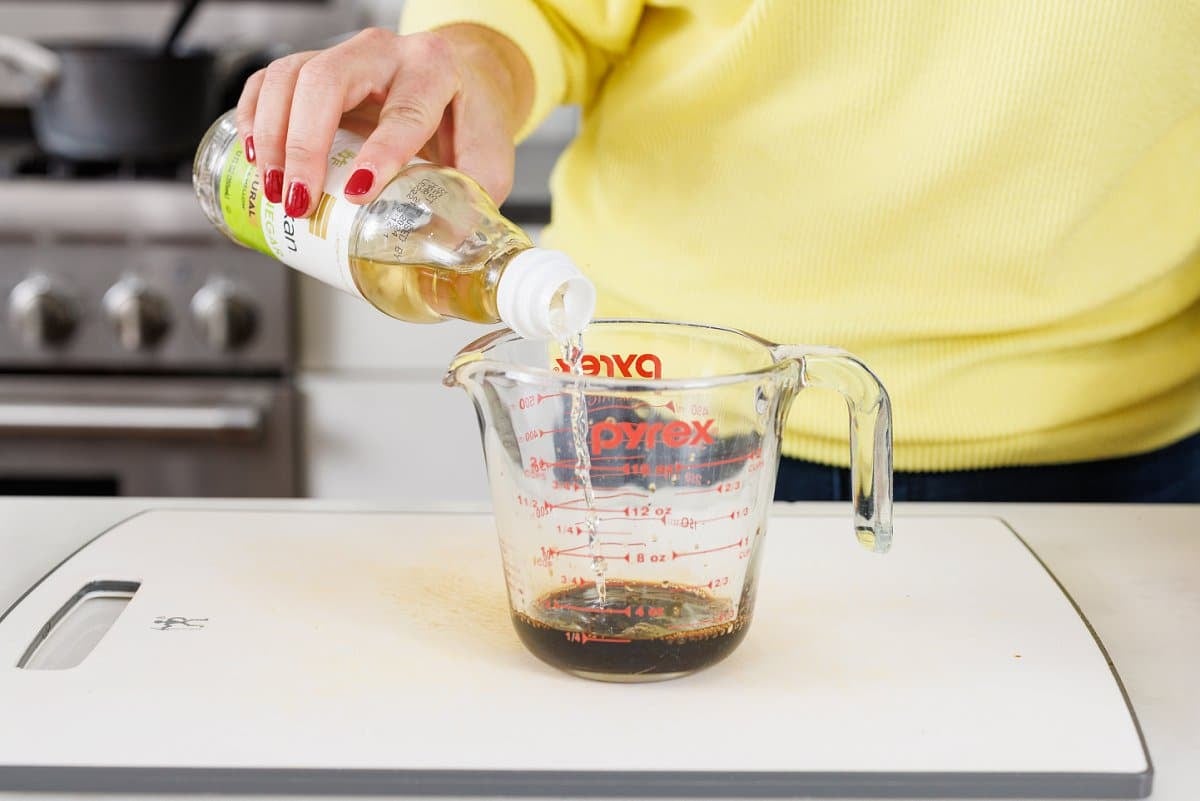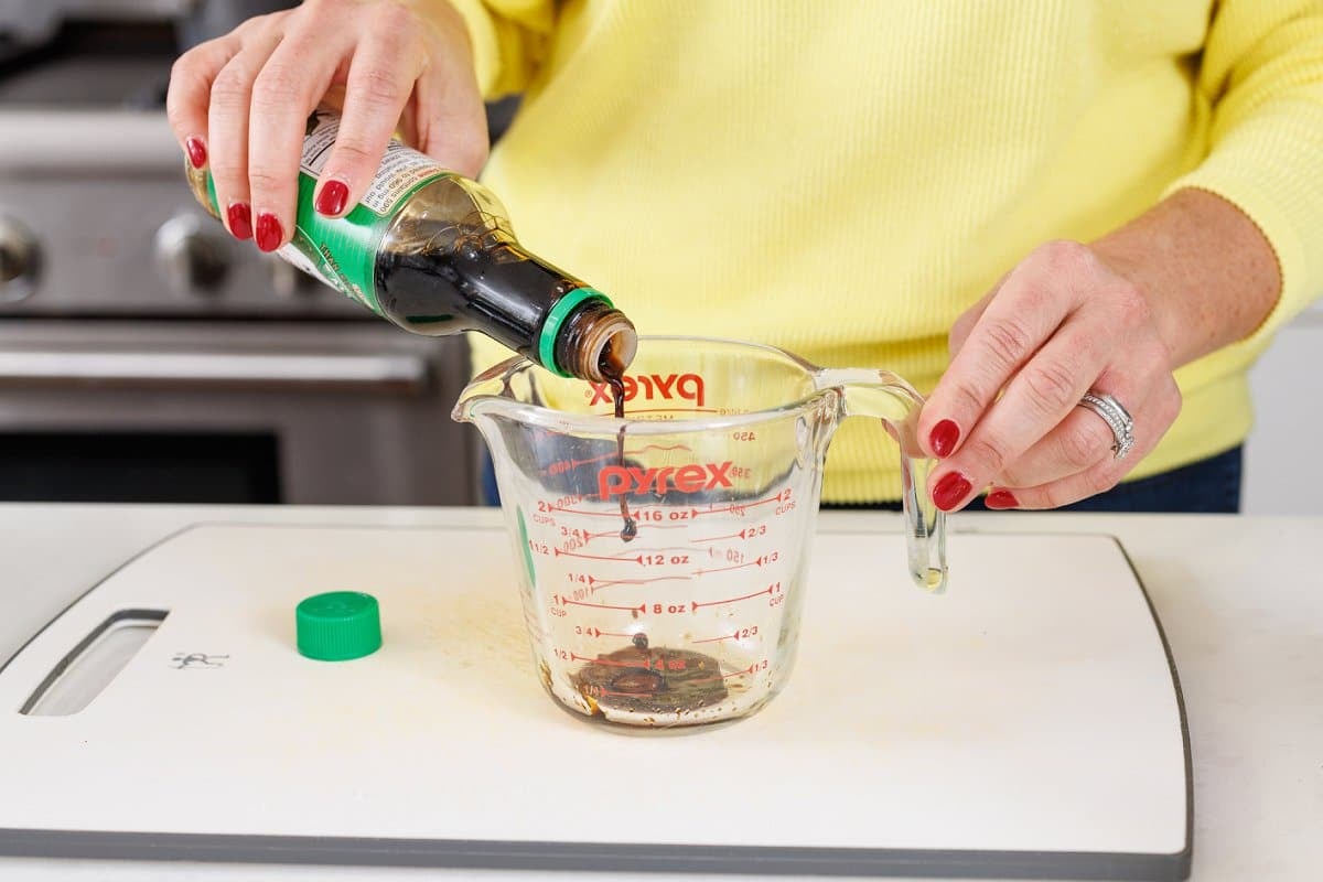 While chicken is cooking, make your stir-fry sauce. Start by adding the soy sauce into a bowl or measuring cup.