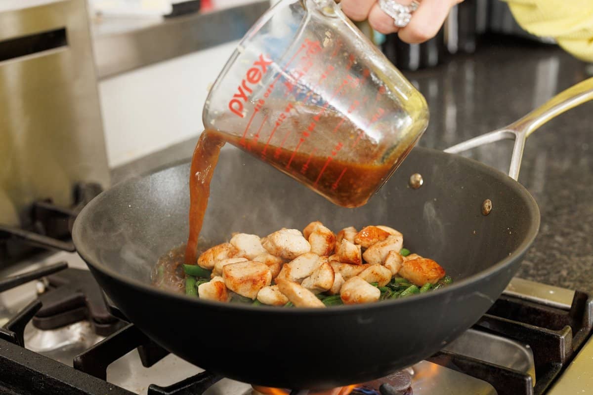 Pour in the sauce and stir to evenly coat chicken and green beans. Let simmer until green beans finish cooking.