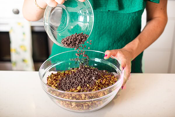While there is cocoa powder in the granola, I love to give it an added chocolate boost by tossing in mini chocolate chips at the end. Pro Tip: Let the granola cool slightly before stirring in chocolate chips otherwise they will melt right away.