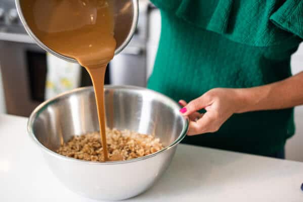 - While granola is baking, melt peanut butter in a glass bowl in microwave until thin and creamuy, about 30-45 seconds.