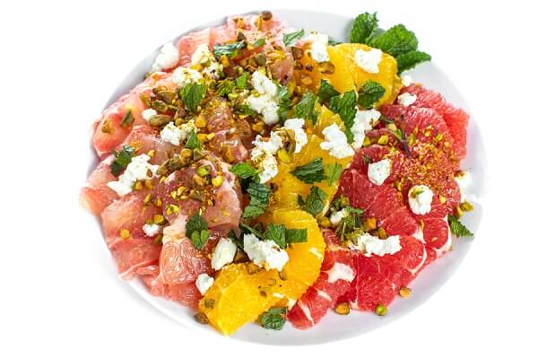 This quick and easy Winter citrus salad is topped with goat cheese, pistachios, mint and olive oil. Simple enough for a casual weeknight dinner but elegant enough for entertaining.