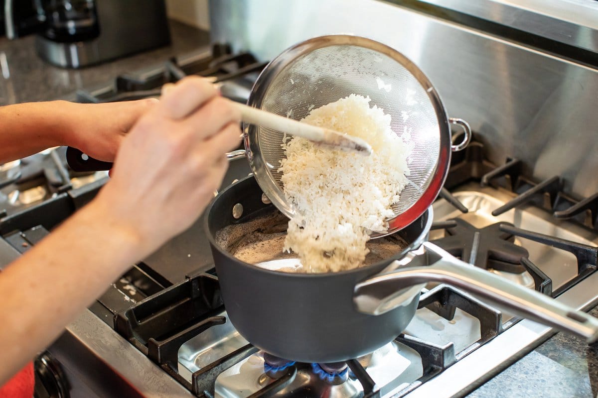 2. Meanwhile, place rice in a mesh strainer and rinse until water comes out clear – about 2 minutes.