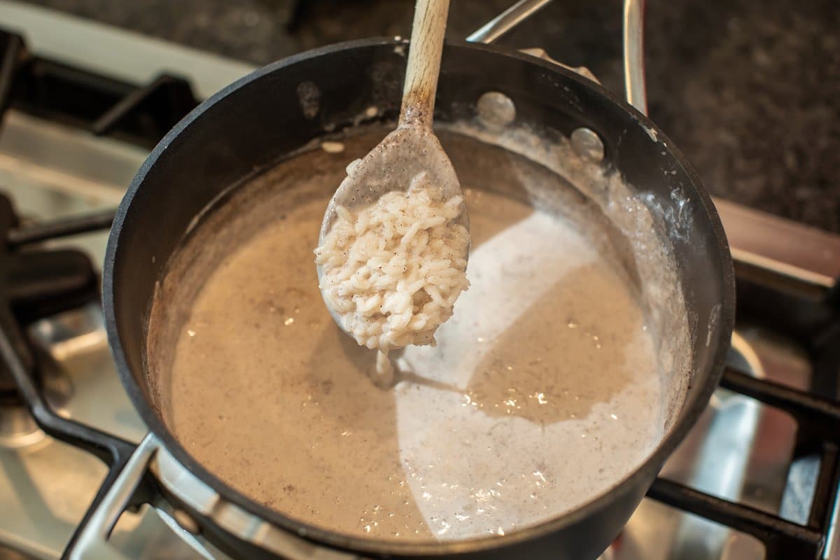 3. When the milk comes to a boil, add rice then simmer on low for 20-25 minutes until liquid is mostly absorbed.