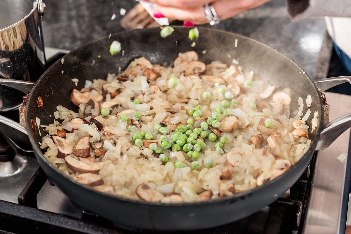 Once the mushrooms and onions have browned and softened, stir in the frozen peas and cook until warm. Remove from the pan and add to a large bowl.
