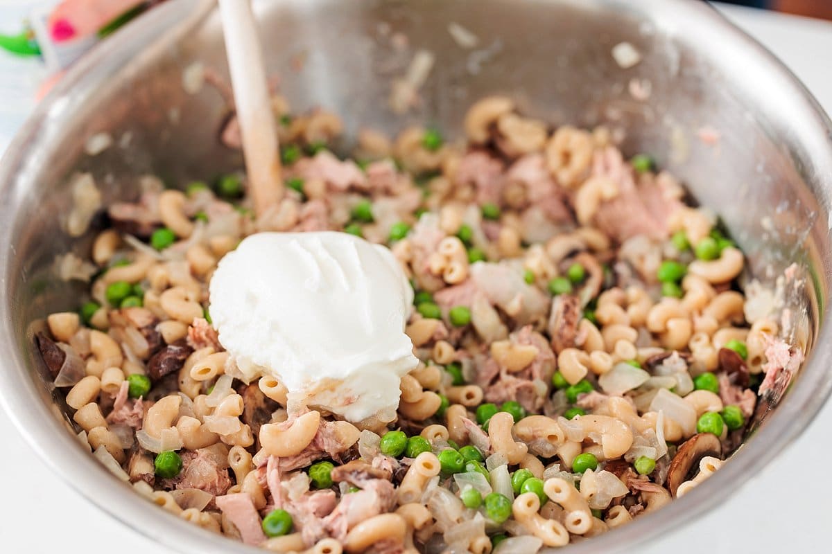 This delicious, creamy tuna casserole is made with baby bella mushrooms, parmesan cheese, and tangy yogurt.