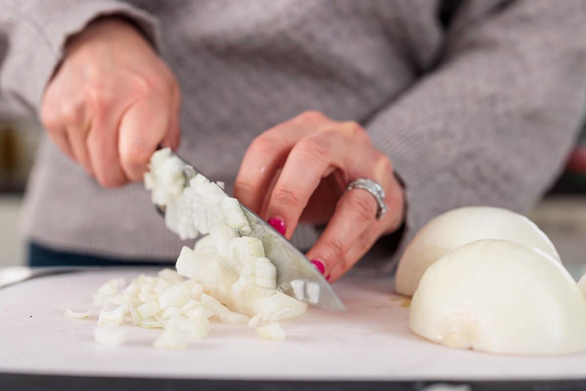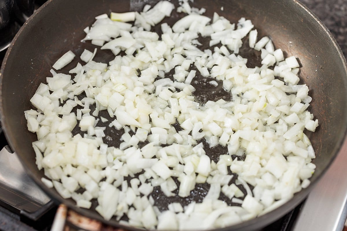 Then, heat some butter or olive oil in a pan and add the diced onion.