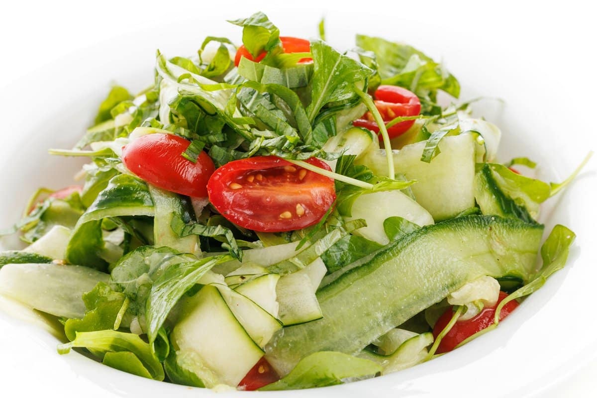 - Arugula: Also called garden rocket, it’s a little bit tart and peppery, which complements the more sweet cucumber and zucchini.