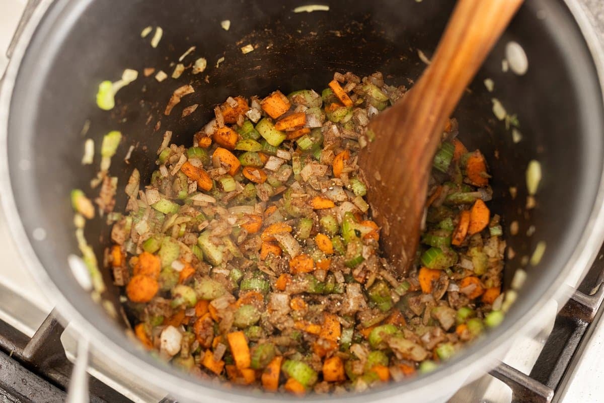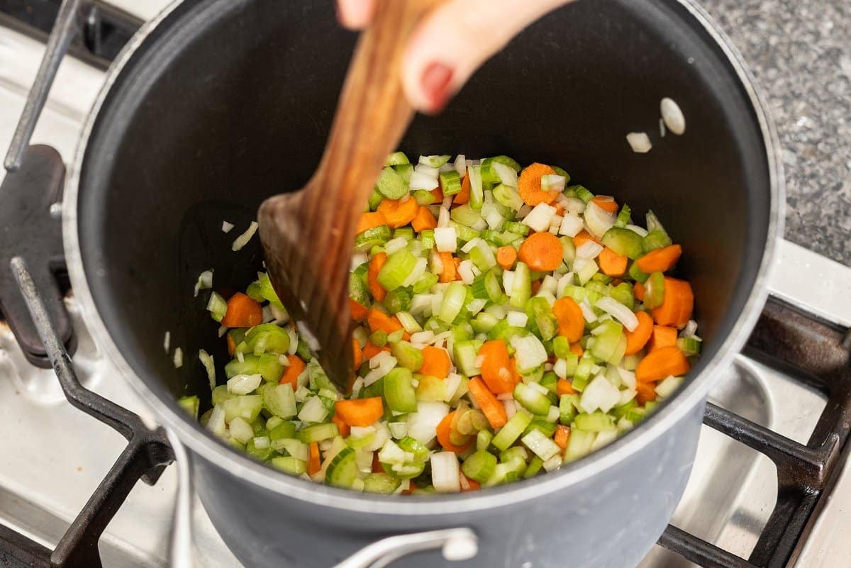 Then in the bottom of a large soup pot, sauté the vegetables over medium heat until they start to soften.