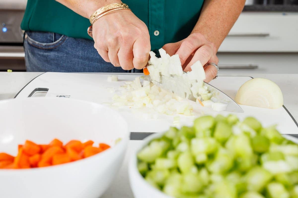 Making this Chicken Soup with Greens is very easy. To start, begin chopping your mirepoix of celery, onions, and carrots.