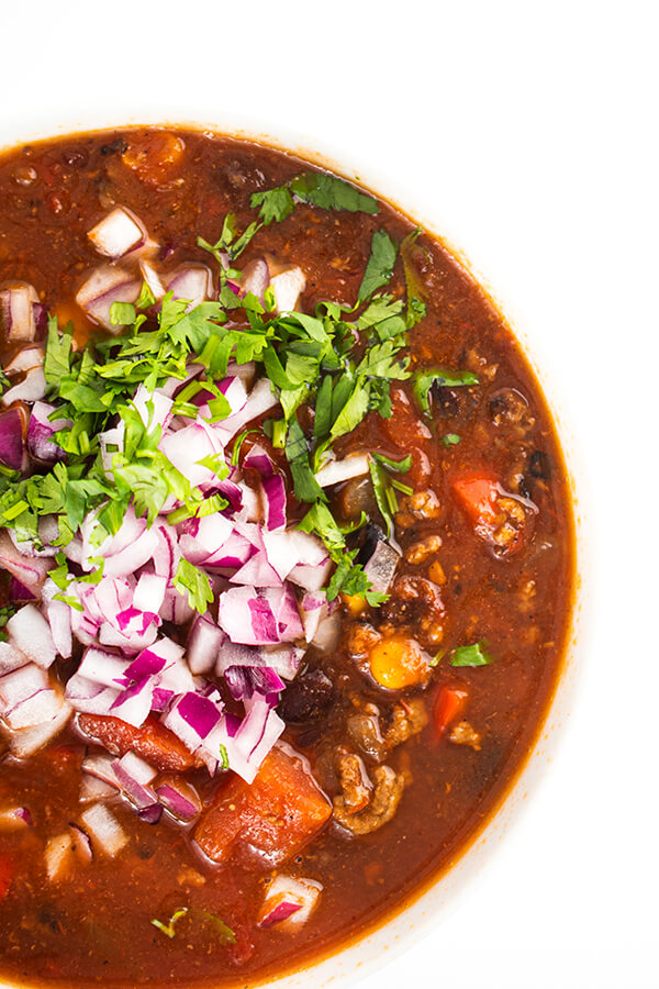 Since it’s not exactly fun to make tacos for one, I often make a big batch of chili on the weekends to reheat for a quick and healthy lunch all week long. Fortunately, both of my boys love chili so we have finally out-numbered my husband.