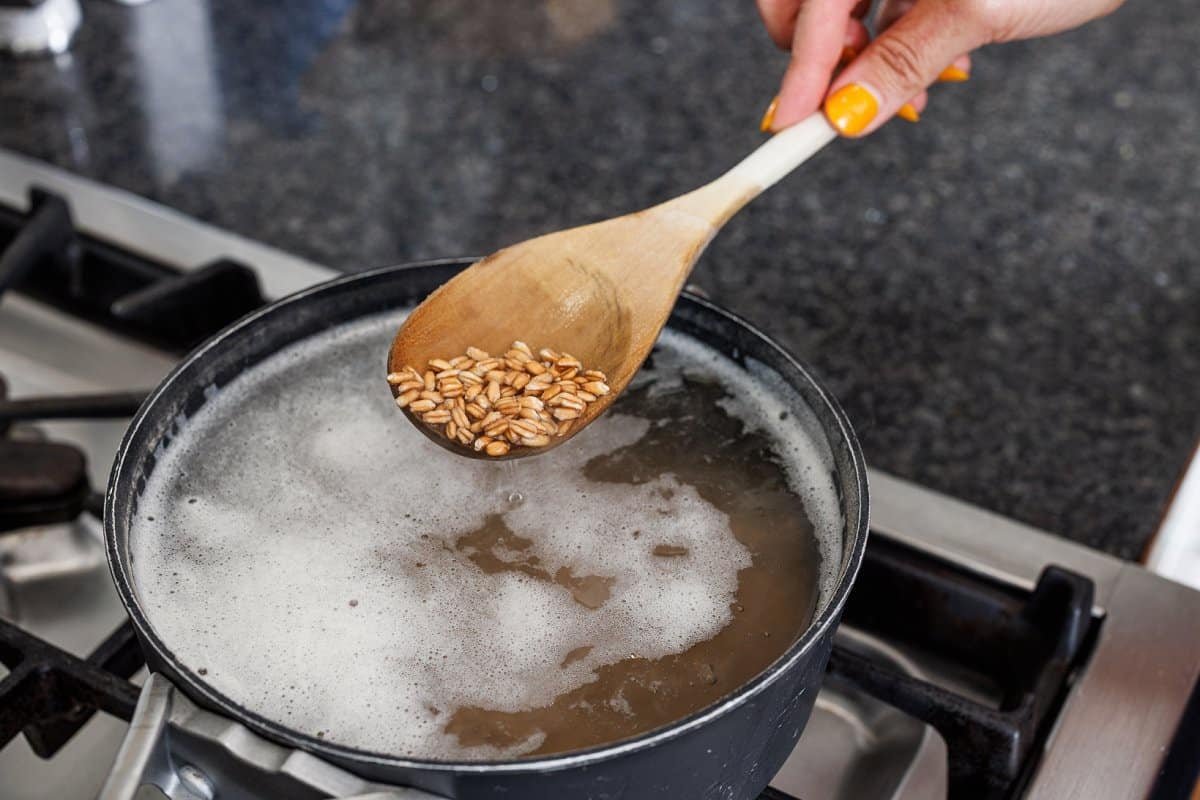 Start your farro salad by cooking your farro according to package instructions, then drain and set aside.