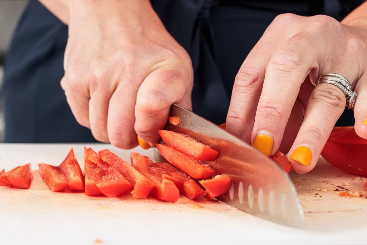 Then deseed your bell pepper, and dice the pepper and tomato.