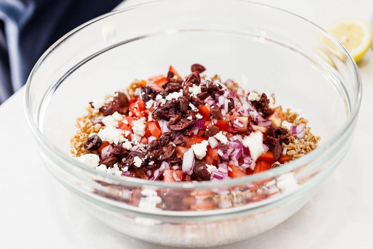 Then take your cooked farro and add it to a large bowl. Add the red pepper, tomato, olives, red onion, and crumbled feta cheese.