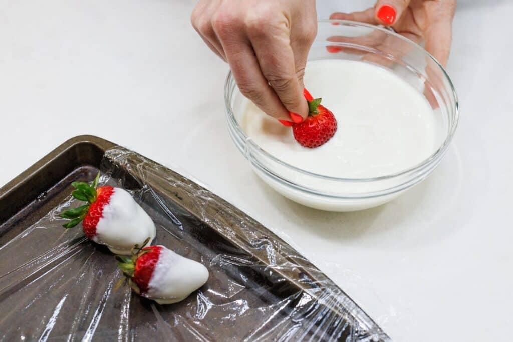 - Place yogurt in a small bowl and dip the strawberries carefully in the yogurt to coat, holding by the stem. Place in a single layer on prepared baking sheet and repeat with remaining strawberries.