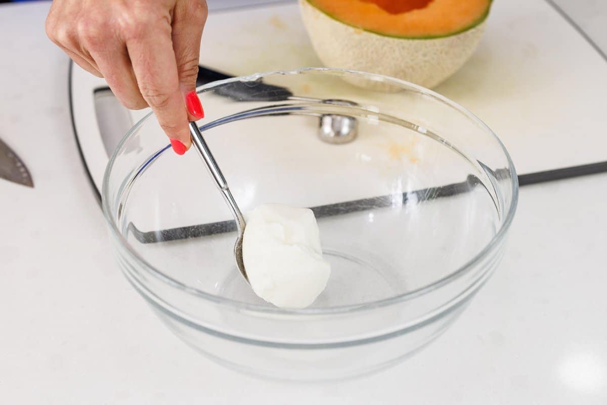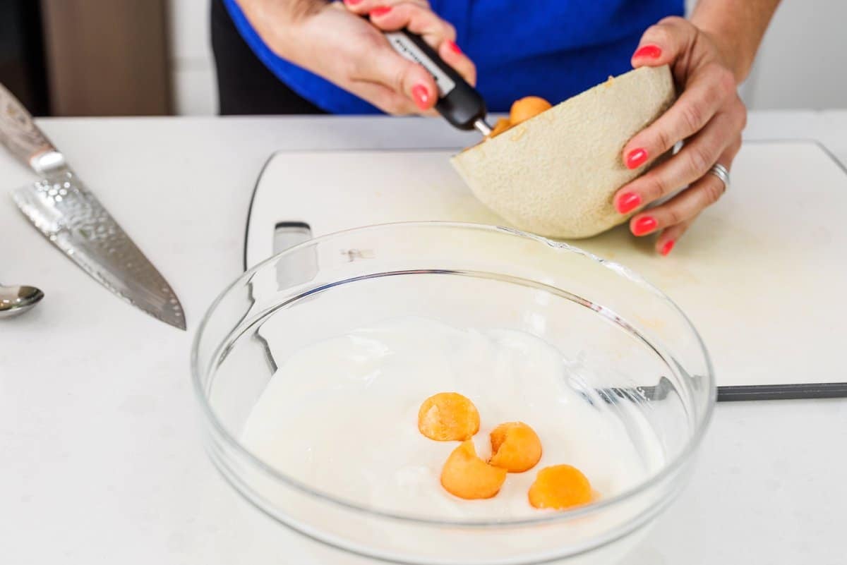 Then take a melon baller and add the cantaloupe to the yogurt.
