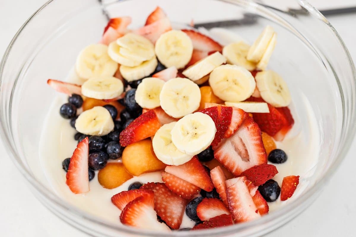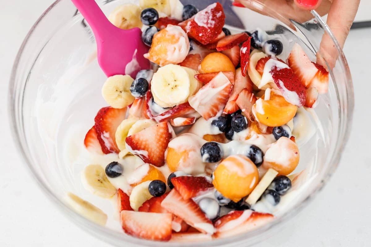 Gently toss until fruit is evenly distributed and everything is coated in the yogurt dressing.
